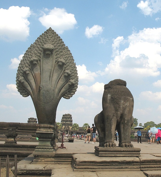 I Nāga talvolta si mischiano agli esseri umani e si riproducono con loro, si narra ad esempio che una principessa dei Nāga si sposò con il primo re dell’antica Cambogia, dalla loro unione sarebbe nato il popolo cambogiano. Secondo questa leggenda questo popolo di serpenti abitava una vasta area dell’Oceano pacifico. Se analizziamo leggende similari dell’area asiatico-pacifica si giunge ad associare gli uomini serpente al mitico continente di Mu, un continente perduto nel più classico stile atlantideo. Ma di questo parleremo poi un’altra volta. In ogni caso su molti templi della regione sono rappresentati i Nāga, vedasi le interessanti statue del tempio di Angkor Wat che rappresentano Nāga a 7 teste (1 per ogni razza della loro società).